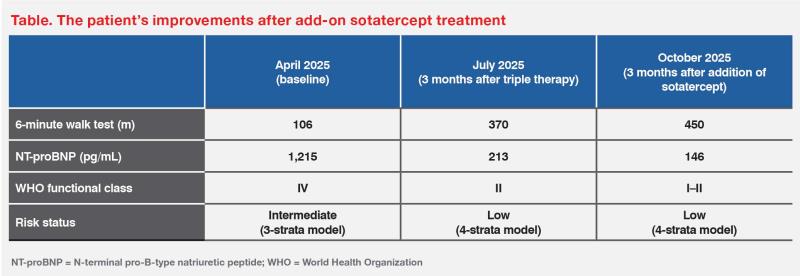 The patient tolerated sotatercept well. After 3 months of addon sotatercept, further clinical improvements were seen: WHO FC I–II, 6MWD 450 m, and NT-proBNP 146 pg/mL – consistent with a low-risk status based on the four-strata model (risk score, 1). (Table)
